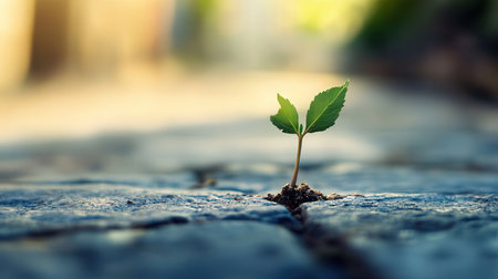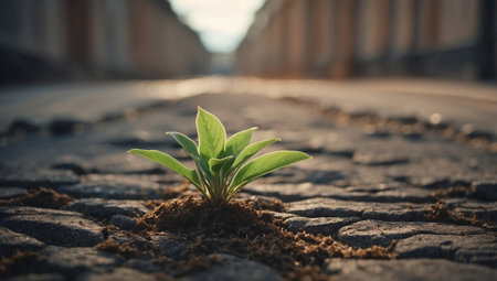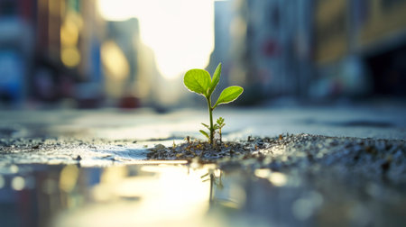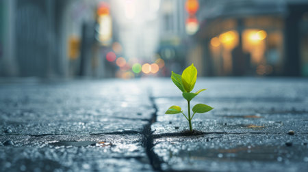 A symbol of growth and resilience, a young green plant sprouts from urban concrete against a blurred cityscape.