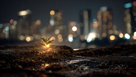 A small plant emerges from the earth against a backdrop of city lights at night. The image displays a shallow depth of field, with the plant in sharp focus. Warm light from the plant contrasts with the cooler tones of the urban setting. Suitable for themes of growth, hope, and sustainability.