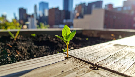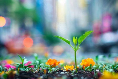 Tiny vibrant sprouts push through rich earth, set against a radiant cityscape glow that symbolizes renewal and optimism amidst urban life.