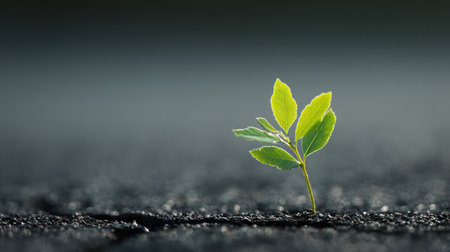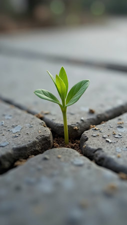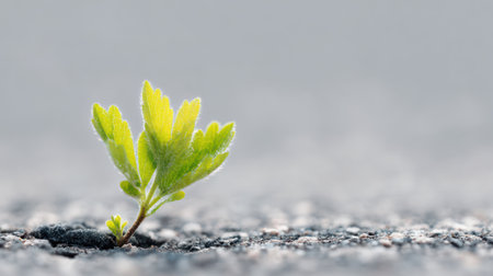 A small plant, showcasing vibrant green leaves, emerges from a crack in the gray pavement. The macro shot highlights the plant's resilience against a textured, cracked surface. Soft focus in the background creates a blurred effect. Suitable for illustrating themes of growth, renewal, and overcoming adversity in various applications.