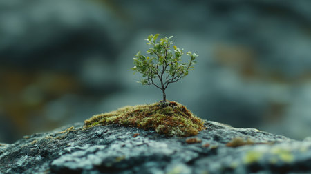 A small vibrant plant emerges from a moss-covered rock, showing its delicate green leaves. The peaceful setting emphasizes the resilience of nature, creating a sense of tranquility and growth.