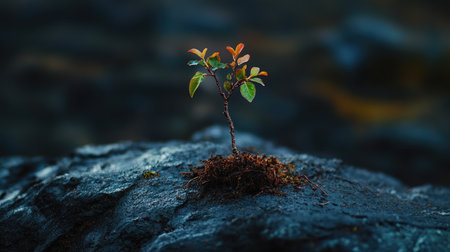 Lonely sprout emerging from boulders crevice defying odds with vibrant leaves