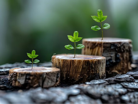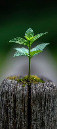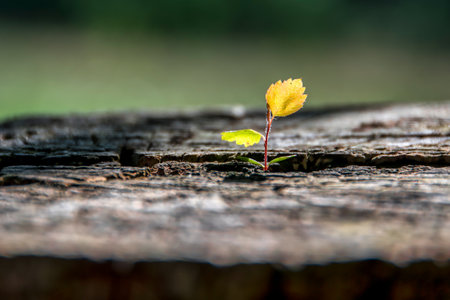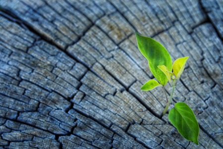 Plant sapling growing on a tree stump with bokeh background