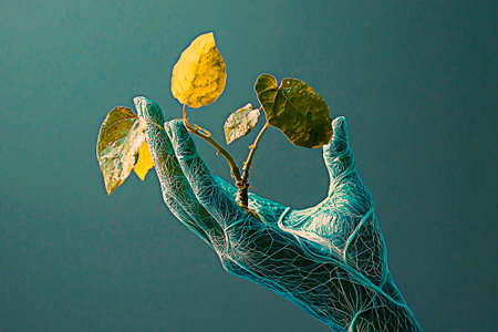 AI Generated - Person's hand holding a small plant with green leaves against a blue background. Commercial illustration artwork for business applications. High resolution. Premium quality. -
