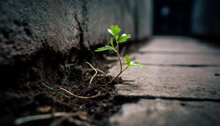 In the midst of urban sprawl, a small plant emerges from a crack in the pavement, symbolizing hope and vitality in the most unlikely of places.