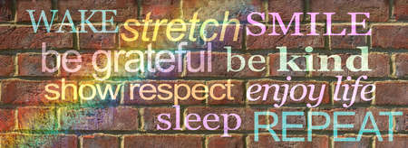 Thanksgiving Reminder to be Grateful for Life - Wake, stretch, smile, be grateful, be kind, show respect, enjoy life, sleep, Repeat in multiple colours on a brown brick wall with a flash of rainbow