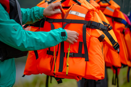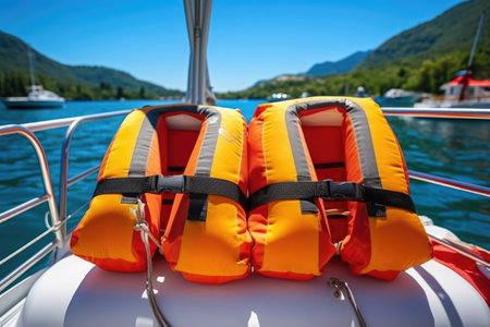 Lifebuoy and orange life jacket on a wooden surface, emphasizing their importance for safe water navigation and emergency response.