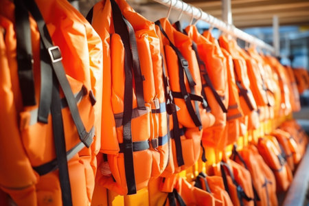lifejackets neatly stacked in storage compartment, created with generative ai