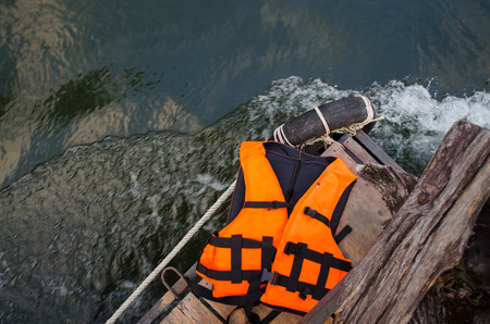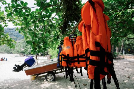 Life jacket hung for tourists and staff when drowning accident blurred background