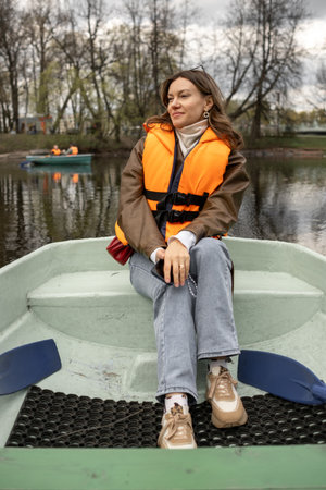 A woman sits in a small boat on a peaceful lake, wearing a bright orange life jacket while enjoying the natural beauty of the surrounding landscape.