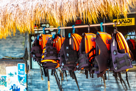 Orange life jackets for hire by the Caribbean sea in Playa del Carmen Quintana Roo Mexico.