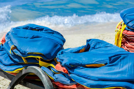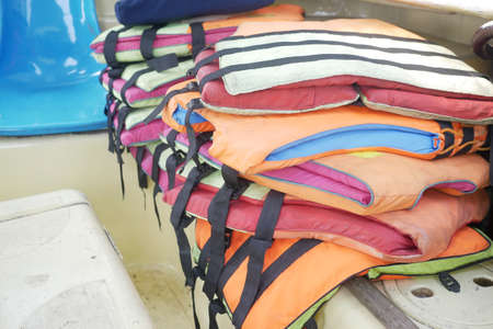 Life jackets, protection and safety of life on the water against the background of the sea.