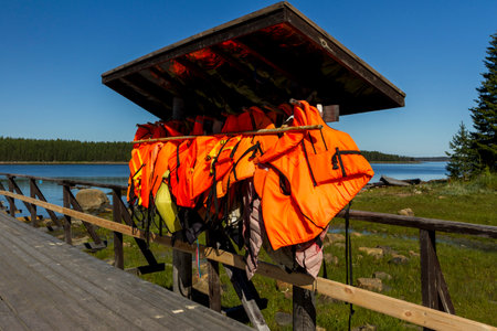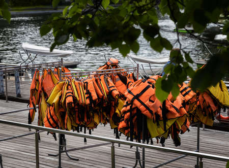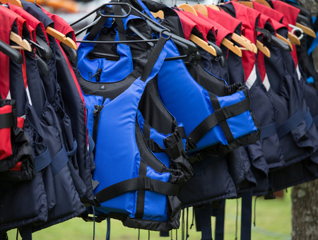 Bright life vests on clothing hanger. Lifesaving equipment for sportsmen and tourists. Excursion on mountain lake.