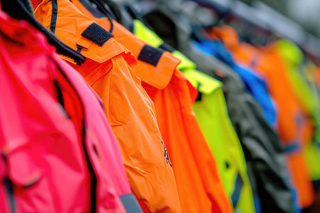 Different life vests and jackets hanging on rack at lake coast for safety and protection in water sports
