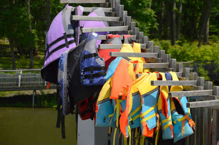 Buoyancy jackets on a rail, used when hiring a jet ski captiva island, Florida America united states taken in march 2006