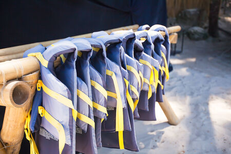 Close-up group of Life jacket or life vest hanging under the shelter at Pangkor Island, Malaysia