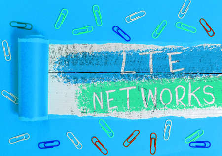 Text sign showing Lte Networks. Business photo showcasing Fastest network connection available for wireless communication Rolled ripped torn cardboard placed above a wooden classic table backdrop