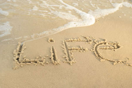 Inscription life on sand. Sea coast with a rolling wave on an inscription