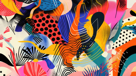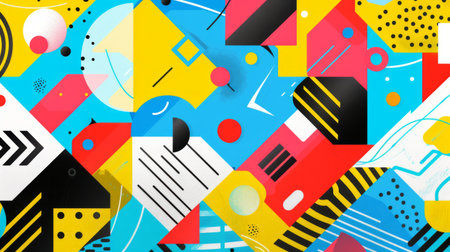 Memphis-style art showcases abstract shapes like zigzags and dots, set against a colorful, dynamic background with playful patterns.