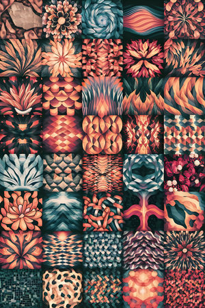 A vibrant and intricate mosaic composed of numerous abstract floral patterns, showcasing a rich palette of colors and textures.
