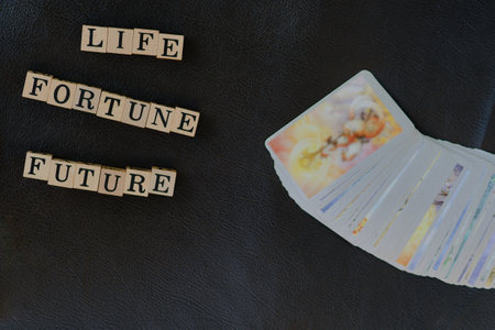 Close-up stack of Tarot cards and wooden letters on message for communication about what people want to know forecasts from tarot cards predictions, Divine magic concept