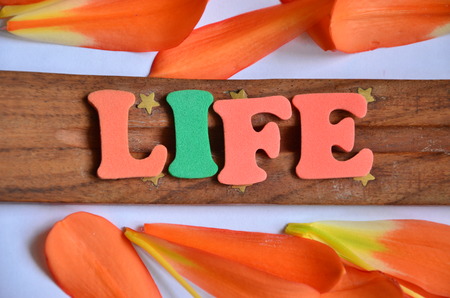 life word on wooden table done with a retro vintage filter and Len vignetting