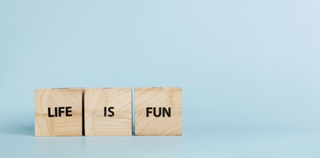 Wooden cubes with inscriptions Life Is Fun on a blue background close-up