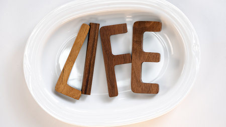 Wooden letters LIFE on a white plate with space for your text.