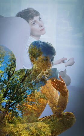 Conceptual image. Silhouette of young transparent woman and sunset landscape isolated over light peach background. Flyer