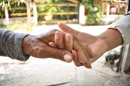 Hand of young girl holds hand of elderly mother. Older generation support.