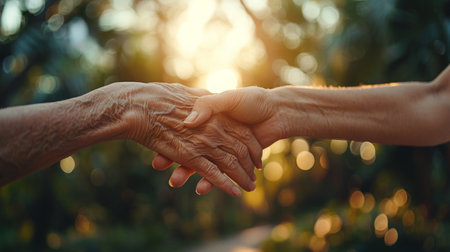 Two elderly individuals share a warm handshake, their hands showing signs of age with wrinkles and tenderness. The scene captures a moment of connection and compassion between them.