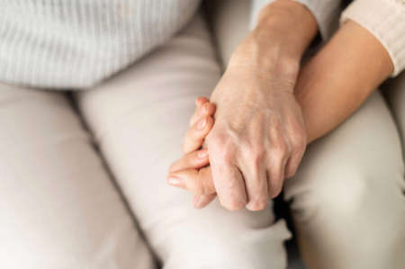 Close up granddaughter takes care of the health sick grandmother at home by holding hands. Lifestyle support the love of the family.