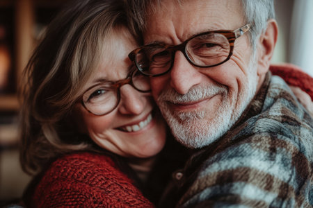 Close-up image of senior couple hugging and holding hands