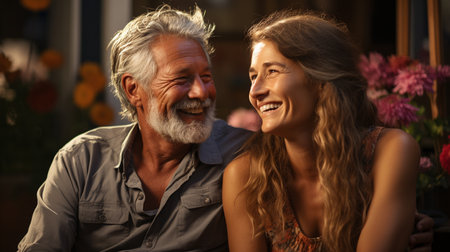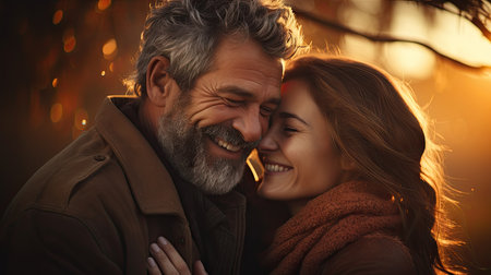 An image features a smiling couple illuminated by warm sunlight. The individuals, one male and one female, appear happy and relaxed. The composition utilizes shallow depth of field, with soft colors and natural lighting, suggesting an outdoor setting. Suitable for various uses, this image could be used for promoting concepts like happiness and togetherness.