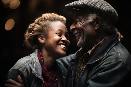 A black man and an Asian woman share a joyful moment smiling widely. The setting highlights their happiness with an emphasis on diversity and family unity.