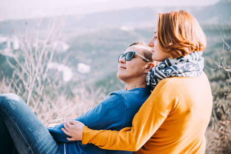 Young couple hugging during a trekking day