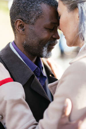 Elderly mixed race couple African American man and Caucasian woman enjoying outdoors their relationship.