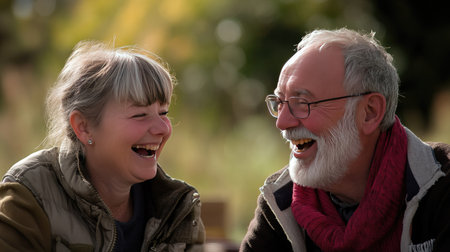 A cheerful retired couple enjoying a picnic, sharing a laugh, with a blurred natural background.