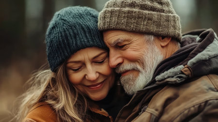 Elderly couple shares a tender moment surrounded by natures embrace. Concept Love, Nature, Elderly, Affection, Relationships
