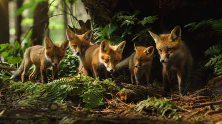 A group of curious fox cubs exploring the lush forest floor, surrounded by green foliage and natural woodland scenery.
