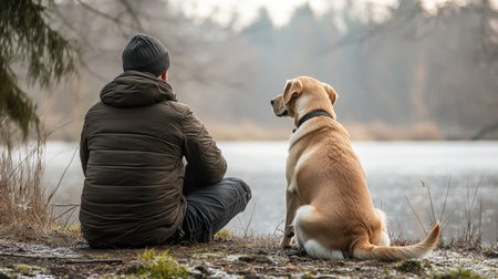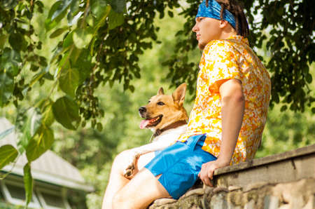 a young caucasian man with a dog is sitting looking far away