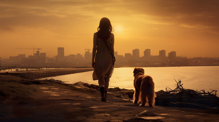 Girl and dog on the lake on sunset background