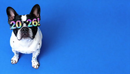 New Year 2020. Beagle tricolor puppy posing. Cute white-brown-black doggy or pet playing on grey