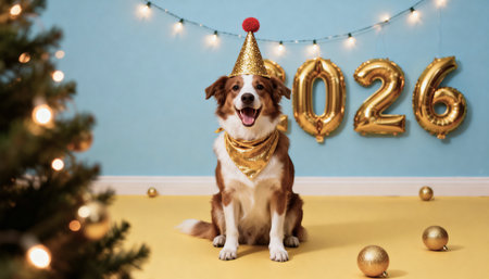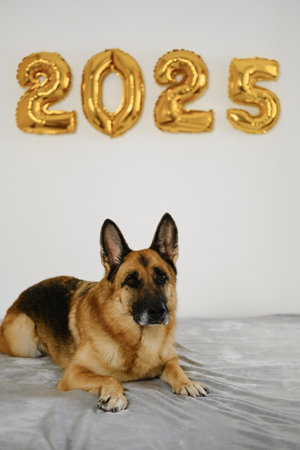 Greeting card with a dog on grey sofa and golden balloons in the shape 2025 on white wall - Happy New Year and Merry Christmas concept. German shepherd celebrate winter holidays