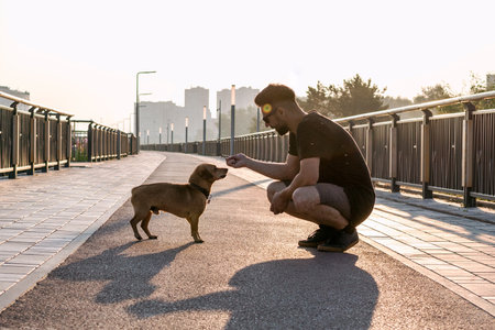 Young handsome man is feeding his dog from hand in the morning on empty street of city.