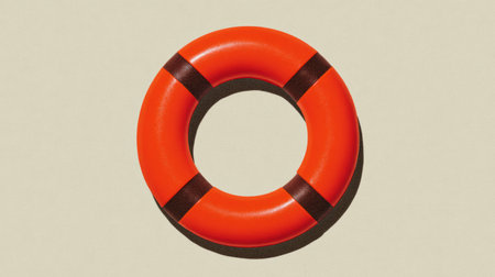 A life preserver floating on calm blue waters, contrasting red and white against serene blue, representing safety and peace.