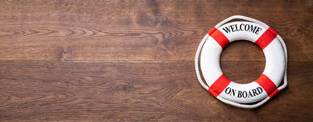 Elevated View Of Lifebuoy With Welcome Aboard Text On Wooden Plank