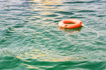 Orange lifebuoy in water. Life saving and help concept. Risks and safety in the water during summer season.