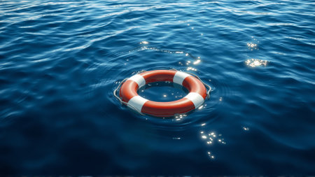 Lifebuoy floating on tranquil sea water, representing safety and assurance for swimmers in danger