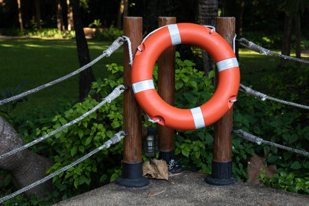 Orange lifebuoy hanging on a column in a park near the lake